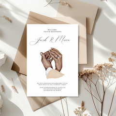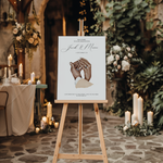 Een romantisch welkomstbord met een stijlvolle illustratie van een koppel hand in hand. Symbool voor een nieuw begin vol liefde en toewijding. De zachte uitstraling maakt dit bord een sfeervol detail bij de entree van jullie dag. De illustratie is beschikbaar in verschillende huidskleuren, zodat het ontwerp aansluit bij jullie stijl en verhaal.