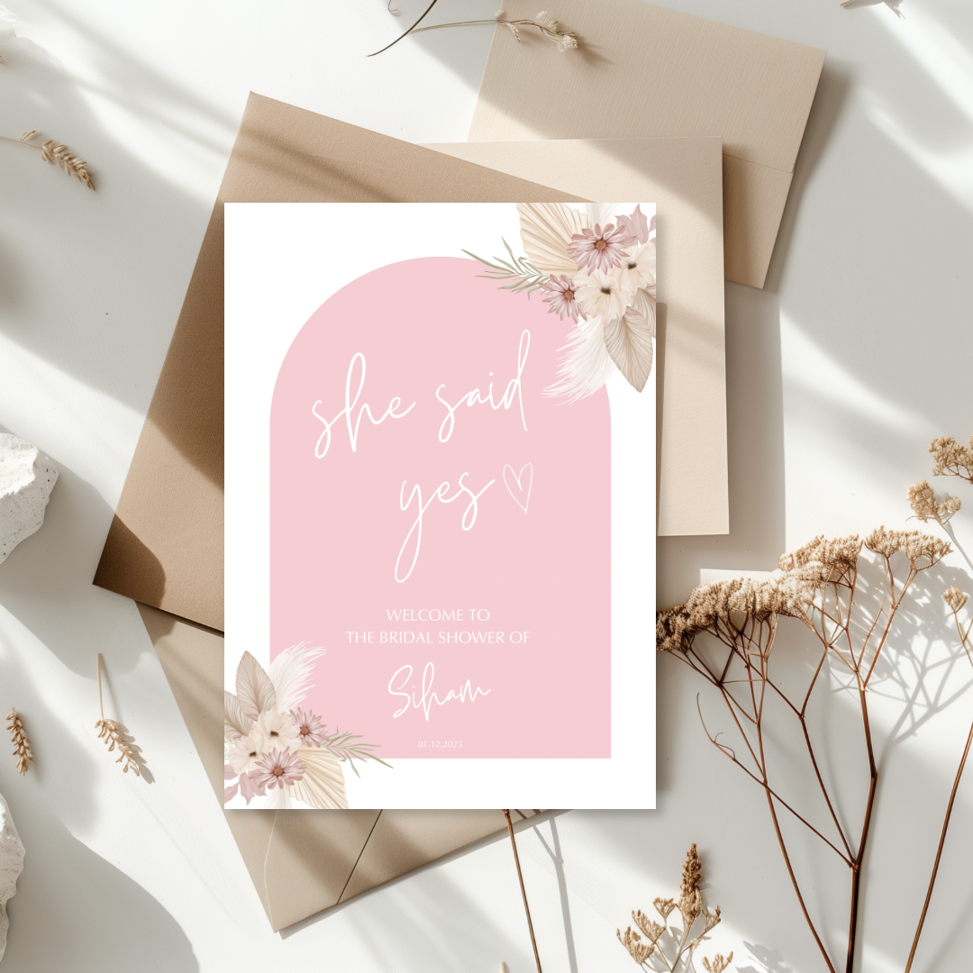 Kaart Bridal Shower - Roze boog met bloemen - She Said Yes