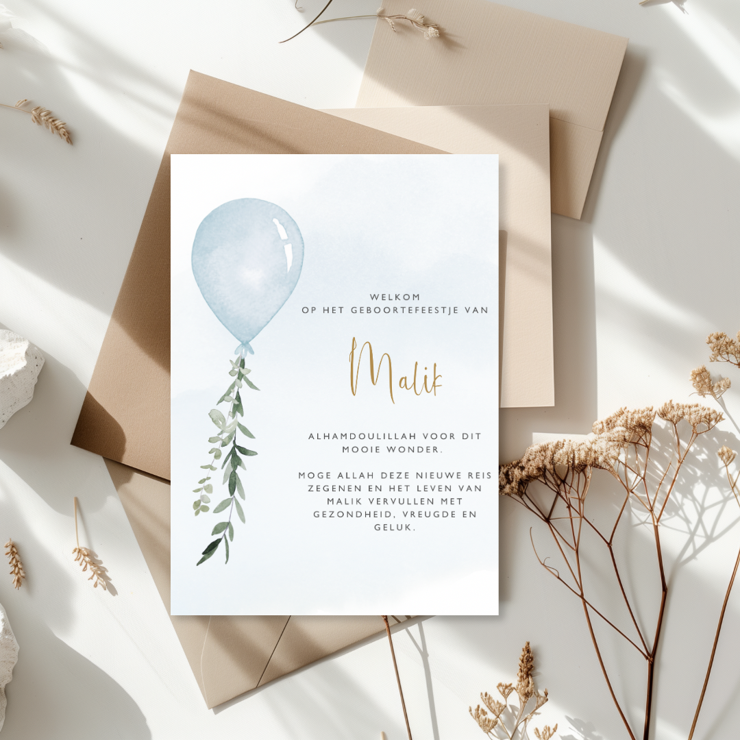 Een fris en teder ontwerp met een blauwe ballon. Deze kaarten stralen zachtheid en eenvoud uit en vormen een stijlvolle aanvulling rondom de geboorte van jullie zoon. Een mooi detail met een liefdevolle uitstraling.