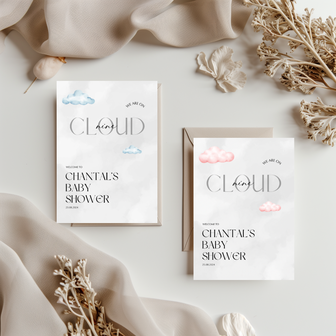 Een strak, modern ontwerp met wolkjes in roze. Deze kaarten brengen rust, stijl en een zachte sfeer aan tafel. Ideaal voor een verfijnde babyshower.