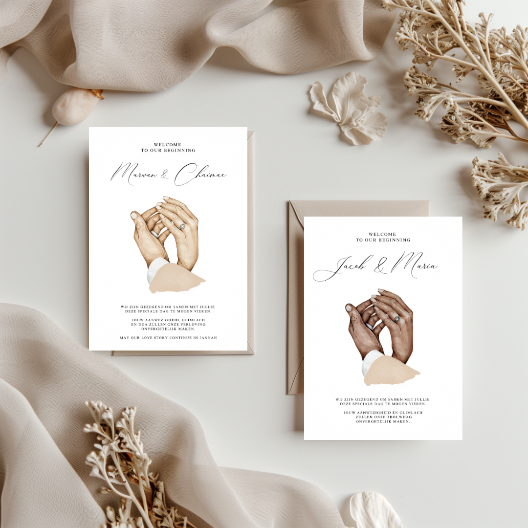 Een romantisch ontwerp met een stijlvolle illustratie van een koppel hand in hand. Symbool voor een nieuw begin vol liefde en toewijding. De zachte uitstraling en betekenisvolle boodschap maken deze kaarten een sfeervol detail op iedere tafel. De illustratie is beschikbaar in verschillende huidskleuren, zodat het ontwerp aansluit bij jullie stijl en verhaal.