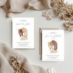 Een romantisch ontwerp met een stijlvolle illustratie van een koppel hand in hand. Symbool voor een nieuw begin vol liefde en toewijding. De zachte uitstraling en betekenisvolle boodschap maken deze kaarten een sfeervol detail op iedere tafel. De illustratie is beschikbaar in verschillende huidskleuren, zodat het ontwerp aansluit bij jullie stijl en verhaal.
