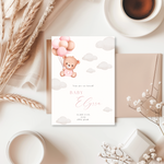 Een lieflijk ontwerp met een beertje en roze ballonnen, omringd door zachte wolkjes. Deze tafelkaarten zijn een warme en feestelijke toevoeging bij het vieren van de geboorte van jullie kleintje. Lief, sfeervol en perfect in balans.