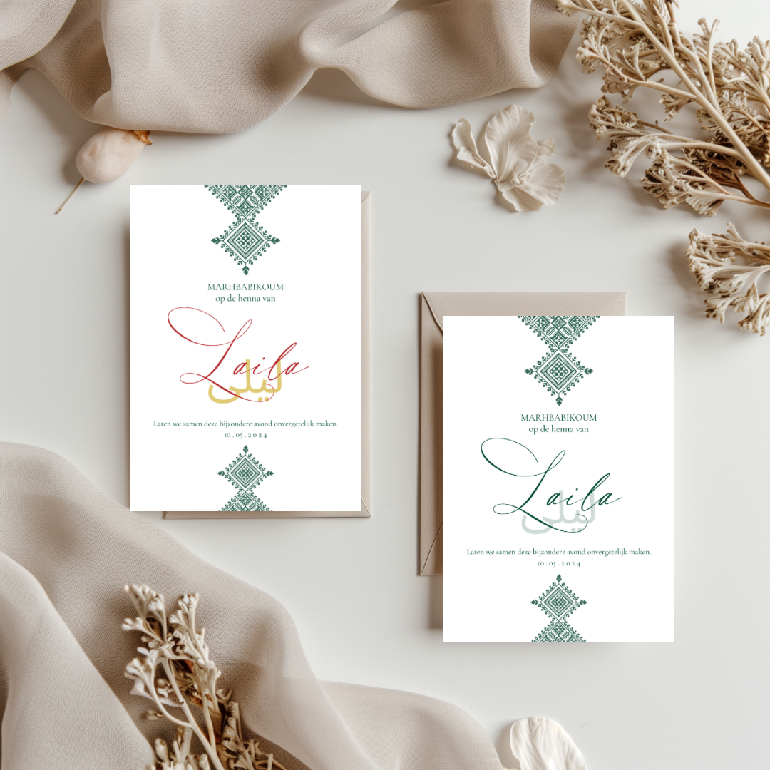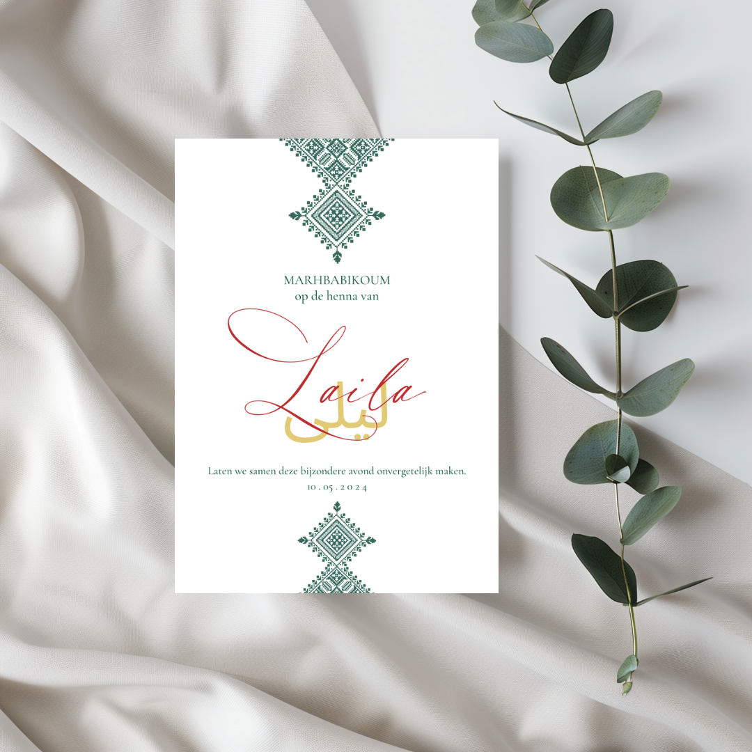 Een stijlvol ontwerp met een verfijnd groen Fessi-patroon. De naam wordt weergegeven in zowel de Nederlandse schrijfwijze als in het Arabisch, een prachtige en persoonlijke toevoeging die traditie en elegantie samenbrengt.