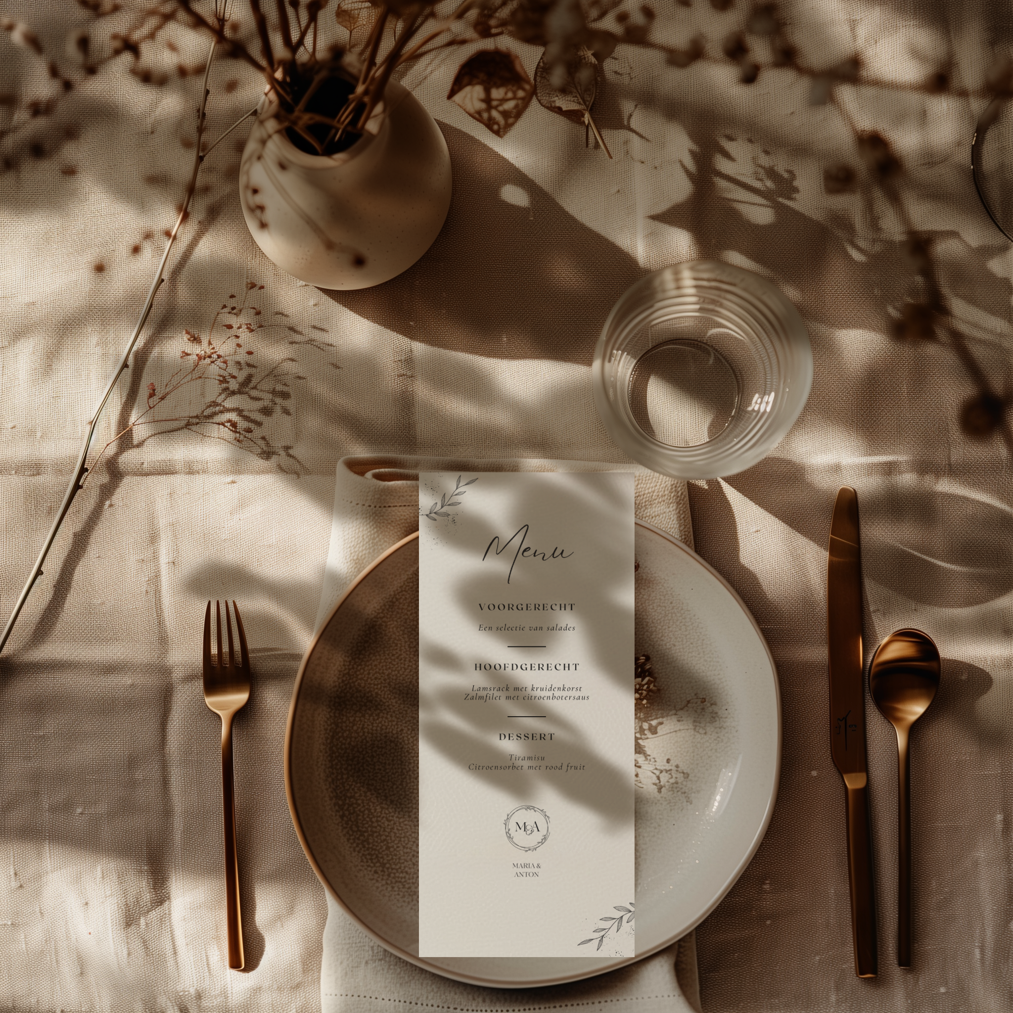 Deze menukaart is ontworpen om jouw tafelsetting op een stijlvolle en verfijnde manier compleet te maken. Het rustige en tijdloze menukaart ontwerp zorgt voor een luxe uitstraling en laat de gerechten mooi tot hun recht komen.