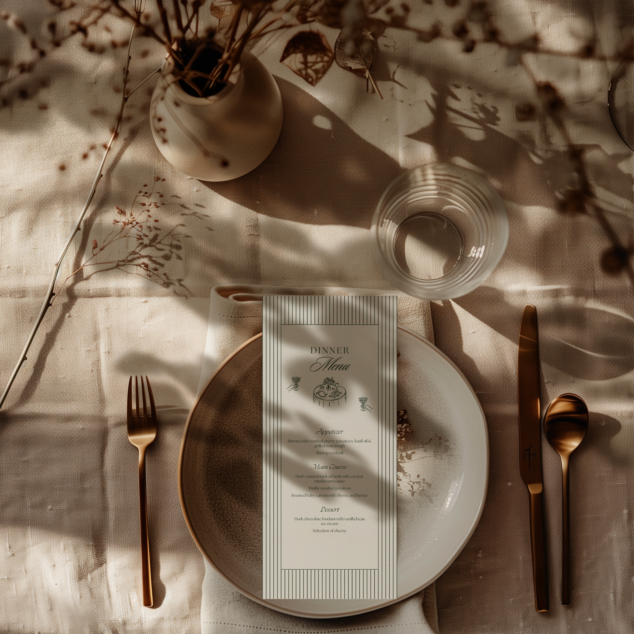 Deze menukaart is ontworpen om jouw tafelsetting op een stijlvolle en verfijnde manier compleet te maken. Het rustige en tijdloze menukaart ontwerp zorgt voor een luxe uitstraling en laat de gerechten mooi tot hun recht komen.