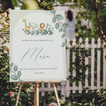 Een vrolijk en uitnodigend ontwerp met schattige jungle dieren in zachte kleuren. Dit bord is perfect om gasten te verwelkomen op de verjaardag van jouw kleintje en zorgt meteen voor een feestelijke sfeer vol speelsheid en charme. Ideaal voor een kinderverjaardag die in het teken staat van plezier en verwondering.