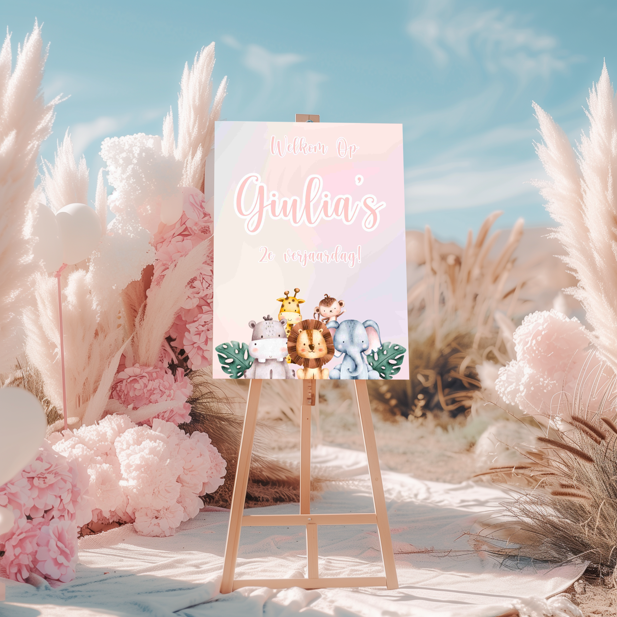 Een speels ontwerp met lieve jungle dieren op een zachte pastelachtergrond. Dit welkomstbord straalt vrolijkheid en verwondering uit en vormt de perfecte binnenkomer voor een kinderverjaardag. De kleurrijke illustraties en zachte tinten zorgen voor een feestelijke en kindvriendelijke sfeer.