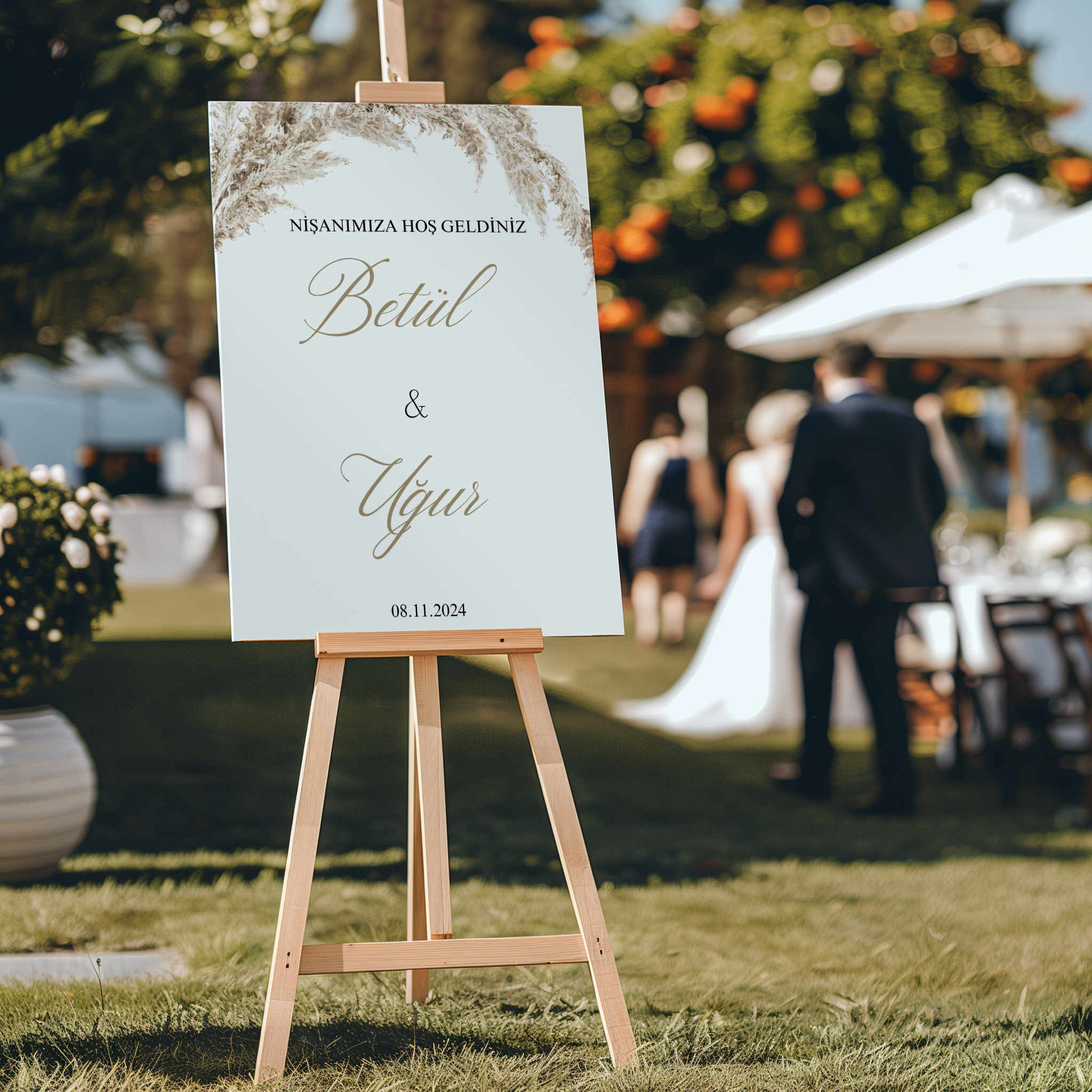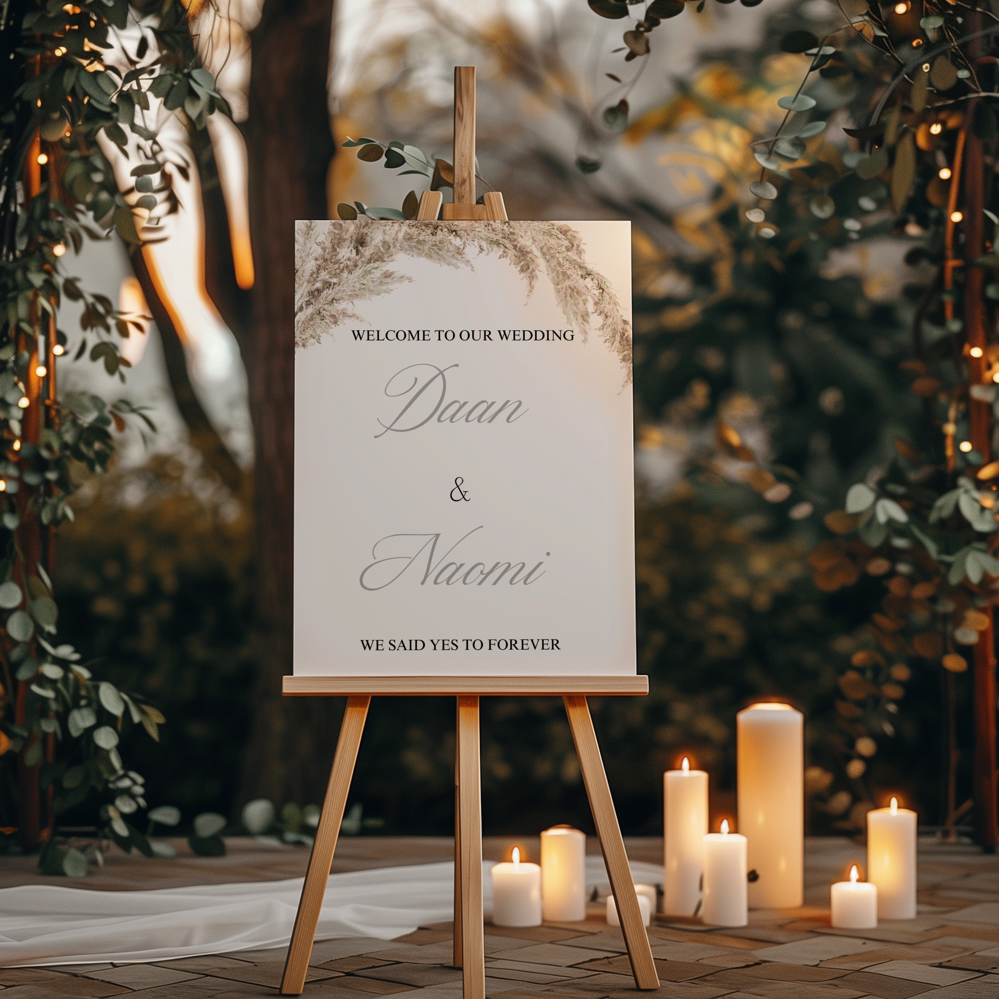 Een klassiek ontwerp met een natuurlijke twist. Dit welkomstbord is afgewerkt met elegante pampas voor een warme, stijlvolle entree. Een subtiel maar sfeervol detail dat direct de toon zet voor een bijzondere dag.