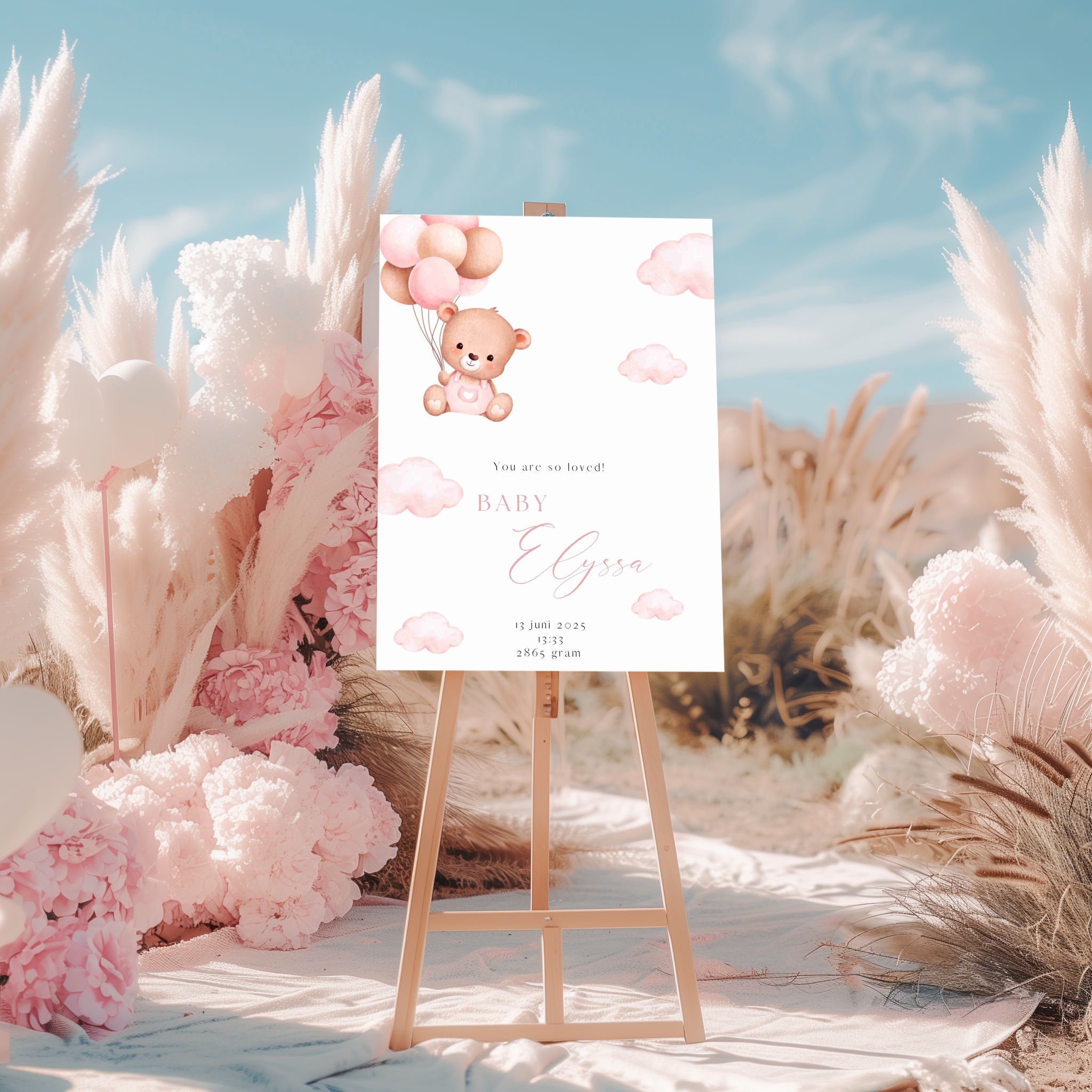 Een lieflijk ontwerp met een beertje en roze ballonnen, omringd door zachte wolkjes. Dit bord is een warme en feestelijke toevoeging bij het vieren van de geboorte van jullie kleintje. Lief, sfeervol en perfect in balans.Bijpassende tafelkaarten zijn beschikbaar voor een mooi geheel in dezelfde stijl.