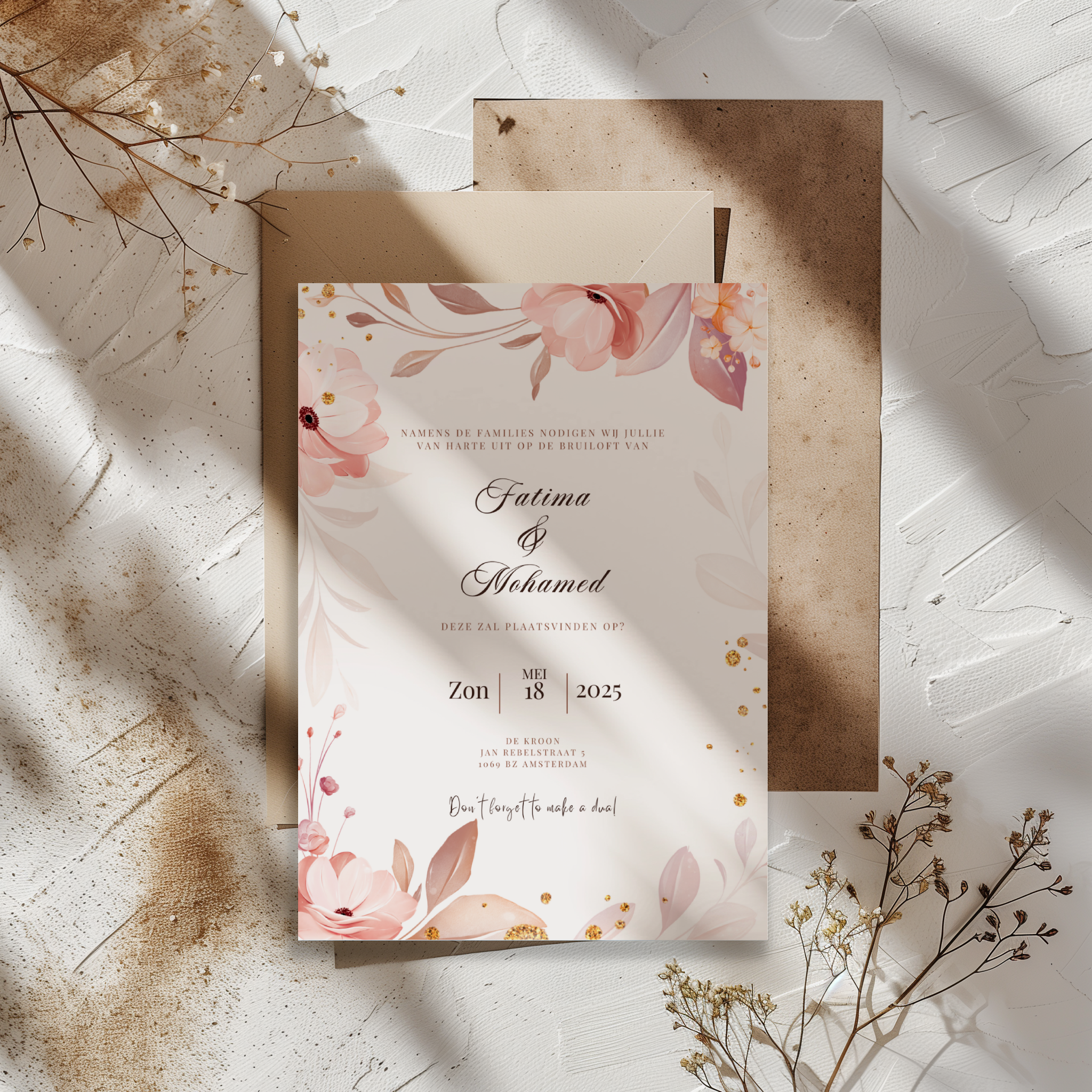 De uitnodiging past bij uiteenlopende bruiloftsstijlen, van klassiek en romantisch tot modern en minimalistisch. Door het evenwichtige ontwerp ontstaat een verfijnd geheel dat moeiteloos aansluit bij de sfeer van jullie viering.