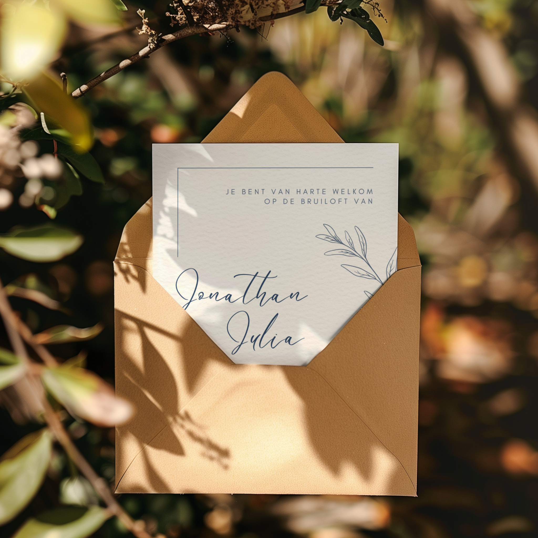 De uitnodiging past bij uiteenlopende bruiloftsstijlen, van klassiek en romantisch tot modern en minimalistisch. Door het evenwichtige ontwerp ontstaat een verfijnd geheel dat moeiteloos aansluit bij de sfeer van jullie viering.